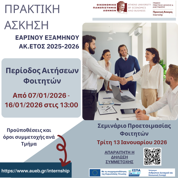 Στο πλαίσιο της πράξης «Πρακτική Άσκηση Οικονομικού Πανεπιστημίου Αθηνών ακ. ετών 2024-2025, 2025-2026 και 2026-2027» με κωδικό MIS: 6018829 στο Πρόγραμμα «Ανθρώπινο Δυναμικό και Κοινωνική Συνοχή 2021-2027», καλούνται οι ενδιαφερόμενοι/νες φοιτητές/τριες να δηλώσουν το ενδιαφέρον τους για Πρακτική Άσκηση Εαρινoύ Εξαμήνου Ακ. Έτους 2025 – 2026, υποβάλλοντας ηλεκτρονική αίτηση αποκλειστικά μέσω του ΠΣ Πρακτικής Άσκησης ΟΠΑ.