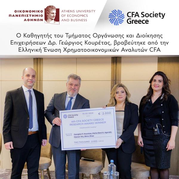 Το Οικονομικό Πανεπιστήμιο Αθηνών ανακοινώνει με ιδιαίτερη χαρά ότι ο Δρ. Γεώργιος Κουρέτας, Καθηγητής του Τμήματος Οργάνωσης και Διοίκησης Επιχειρήσεων, αποτελεί μέλος της συγγραφικής ομάδας που βραβεύτηκε από την Ελληνική Ένωση Χρηματοοικονομικών Αναλυτών CFA, στο πλαίσιο του τέταρτου ετήσιου CFA Society Greece Annual Research Award.