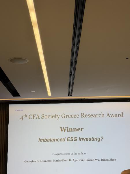 Το Research Award απονεμήθηκε στο άρθρο με τίτλο: «Imbalanced ESG Investing?» των Μαρίας-Ελένης Κ. Αγοράκη, Γεωργίου Π. Κουρέτα, Haoran Wu και Binru Zhao, το οποίο έχει δημοσιευθεί στο έγκριτο διεθνές επιστημονικό περιοδικό Journal of Corporate Finance.