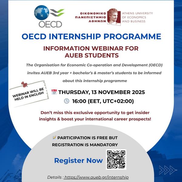 Το Γραφείο Πρακτικής Άσκησης του Οικονομικού Πανεπιστημίου Αθηνών, σε συνεργασία με τον Οργανισμό Οικονομικής Συνεργασίας και Ανάπτυξης (OECD), διοργανώνει ενημερωτικό διαδικτυακό σεμινάριο (webinar) για το OECD Internship Programme.