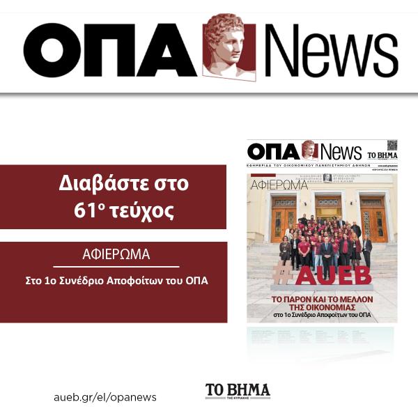 H ΟΠΑ News που κυκλοφόρησε την Κυριακή 22 Φεβρουαρίου με το ΒΗΜΑ ΤΗΣ ΚΥΡΙΑΚΗΣ, με ειδικό αφιέρωμα: "Το παρόν και το Μέλλον της Οικονομίας στο 1ο Συνέδριο Αποφοίτων του ΟΠΑ", τώρα διαθέσιμη και online: