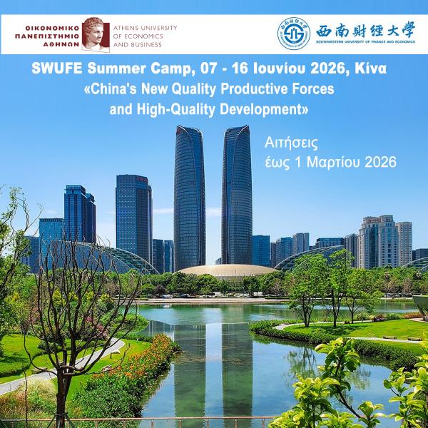 Το Southwestern University of Finance and Economics (SWUFE, Κίνα), ένα υψηλού κύρους εκπαιδευτικό ίδρυμα με το οποίο το ΟΠΑ έχει υπογράψει μνημόνιο συνεργασίας, θα πραγματοποιήσει και φέτος αγγλόφωνο θερινό summer camp με τίτλο «China's New Quality Productive Forces and High-Quality Development» δια ζώσης στις εγκαταστάσεις του στην Chengdu της Κίνας από τις 07 μέχρι τις 16 Ιουνίου 2026. Το SWUFE θα καλύψει για δυο (2) τελειόφοιτους προπτυχιακούς ή μεταπτυχιακούς φοιτητές του ΟΠΑ τη διαμονή για 9 διανυκτερεύσεις από τις 7 έως τις 15 Ιουνίου, καθώς και τα γεύματα για 10 ημέρες (κάρτα γευμάτων για τη φοιτητική καντίνα στο πανεπιστήμιο), τις διαλέξεις, τις επισκέψεις σε εταιρείες και τις πολιτιστικές δραστηριότητες. Οι συμμετέχοντες φοιτητές του ΟΠΑ είναι υπεύθυνοι για τα αεροπορικά εισιτήρια μετ' επιστροφής, τη βίζα, την ασφάλιση και τα προσωπικά τους έξοδα στη Κίνα. Σημειώνεται πως το πρόγραμμα οργανώνεται εξ ολοκλήρου από το SWUFE, χωρίς την συμμετοχή του ΟΠΑ, με το Κινέζικο ίδρυμα να είναι υπεύθυνο για την επιλογή των συμμετεχόντων. Το πρόγραμμα μαθημάτων του θερινού σχολείου επισυνάπτεται, περισσότερες πληροφορίες για το πρόγραμμα εδώ .