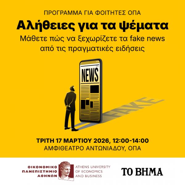 Το Οικονομικό Πανεπιστήμιο Αθηνών, σε συνεργασία με την Alter Ego Media, διοργανώνει την Τρίτη 17 Μαρτίου 2026, 12:00-14:00, το workshop «Αλήθειες για τα ψέματα - Μάθετε πώς να ξεχωρίζετε τα fake news από τις πραγματικές ειδήσεις». Στόχος του workshop είναι η ενίσχυση της κριτικής προσέγγισης απέναντι στις ειδήσεις και η καλλιέργεια δεξιοτήτων αναγνώρισης της αξιόπιστης πληροφόρησης. Η δράση αυτή εντάσσεται στο πλαίσιο της συνεργασίας των δύο φορέων για την προώθηση της υπεύθυνης ενημέρωσης.