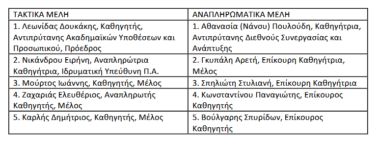 α) Τον Αντιπρύτανη Ακαδημαϊκών Υποθέσεων και Προσωπικού, ως Πρόεδρο, με αναπληρωτή του τον Αντιπρύτανη Διεθνούς Συνεργασίας και Ανάπτυξης.