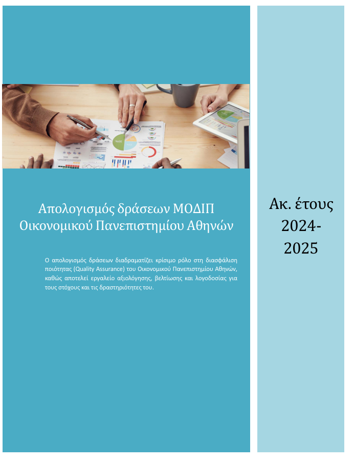 Η Υπηρεσία της ΜΟΔΙΠ συνέταξε το απολογισμό των δράσεών της για το ακαδημαϊκό έτος 2024-2025. Ο απολογισμός δράσεων είναι θεμελιώδης για τη διασφάλιση ποιότητας για το Οικονομικό Πανεπιστήμιο Αθηνών, καθώς συνδυάζει την αξιολόγηση, τη διαφάνεια, την ανατροφοδότηση και τη στρατηγική ανάπτυξη. Μέσω αυτής της διαδικασίας η Μονάδα Διασφάλισης Ποιότητας του Οικονομικού Πανεπιστημίου Αθηνών, επιτυγχάνει τη διαρκή βελτίωση, ενισχύοντας τη φήμη του Ιδρύματος, ανταποκρινόμενη όσο γίνεται πιο αποτελεσματικά στις απαιτήσεις των ενδιαφερόμενων μερών.