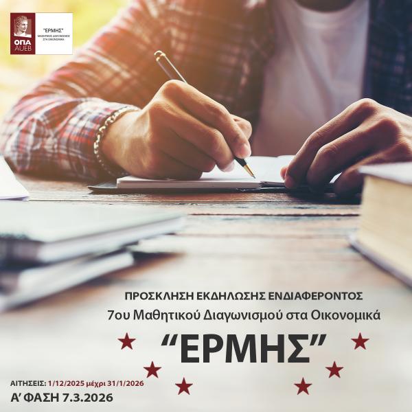 Το Οικονομικό Πανεπιστήμιο Αθηνών (ΟΠΑ) προκηρύσσει τον Έβδομο (7ο) Μαθητικό Διαγωνισμό στα Οικονομικά «ΕΡΜΗΣ» για μαθητές/τριες Γ’ Λυκείου ΓΕΛ και ΕΠΑΛ, καθώς επίσης και για μαθητές/μαθήτριες από την Α’ και Β’ Λυκείου. Ο Διαγωνισμός καθιερώθηκε με αφορμή τον εορτασμό των 100 ετών από την ίδρυση του Οικονομικού Πανεπιστημίου Αθηνών.