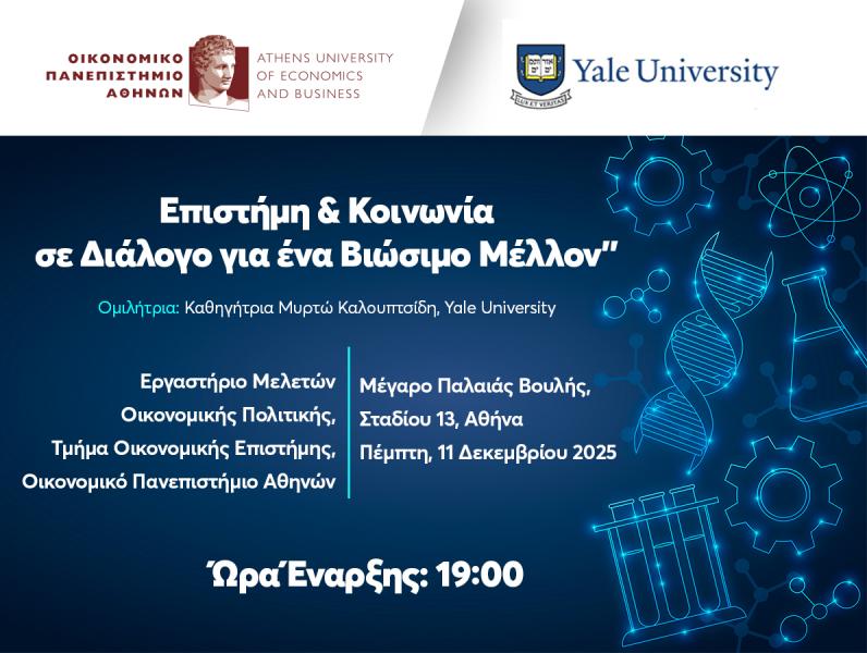 Το Εργαστήριο Μελετών Οικονομικής Πολιτικής (ΕΜΟΠ) του τμήματος Οικονομικής Επιστήμης του Οικονομικού Πανεπιστημίου Αθηνών και το Hellenic Studies Program, του Yale MacMillan Center του Πανεπιστημίου Yale, ΗΠΑ σας προσκαλούν στη σειρά διαλέξεων ανοιχτών προς το κοινό, με στόχο την ενίσχυση της προσβασιμότητας στην επιστημονική γνώση, την προώθηση της επιστημονικής κουλτούρας στην Ελλάδα και τη συμβολή στον δημόσιο διάλογο.