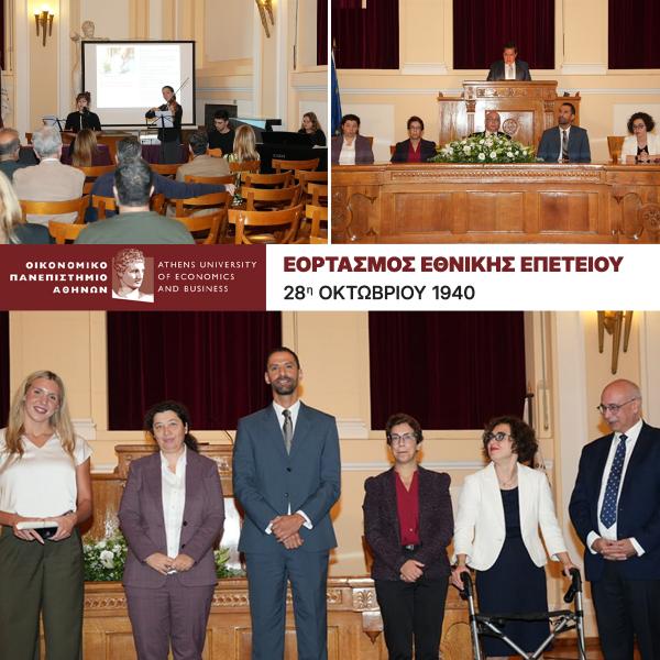 Το Οικονομικό Πανεπιστήμιο Αθηνών, στο πλαίσιο των εορταστικών εκδηλώσεων για τη Εθνική Επέτειο της 28ης Οκτωβρίου, πραγματοποίησε τελετή εορτασμού την Παρασκευή 24 Οκτωβρίου 2025 και ώρα 12:00 στην Αίθουσα Τελετών «Ελευθέριος Βενιζέλος» του Οικονομικού Πανεπιστημίου Αθηνών.