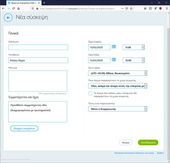Στην καρτέλα που εμφανίζεται συμπληρώνουμε τα απαραίτητα πεδία προκειμένου να δημιουργηθεί μία συνεδρία.