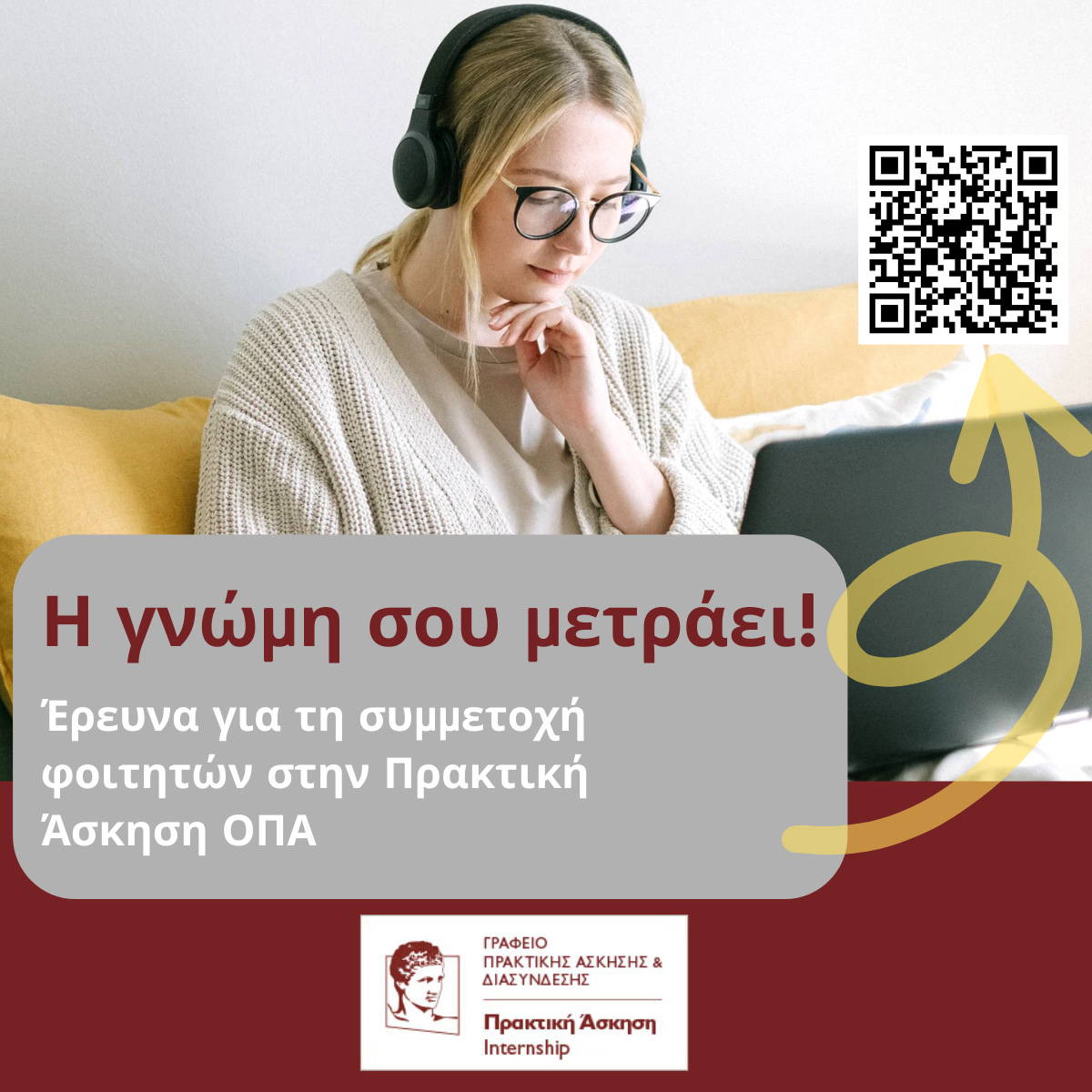 Το Γραφείο Πρακτικής Άσκησης του Οικονομικού Πανεπιστημίου Αθηνών διεξάγει έρευνα στο πλαίσιο της συλλογής δεδομένων ώστε να κατανοήσει καλύτερα τους λόγους που μπορεί να αποτρέπουν φοιτητές και φοιτήτριες από τη συμμετοχή τους στο Πρόγραμμα Πρακτικής Άσκησης.