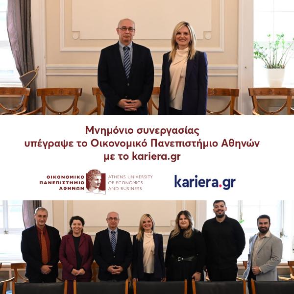 Η Διευθύνουσα Σύμβουλος του kariera.gr, κυρία Μαντώ Πατσαούρα, συμπλήρωσε σχετικά: «Στο kariera.gr, παρακολουθούμε καθημερινά τις εξελίξεις, τις ανάγκες της αγοράς εργασίας και τις τάσεις που τη διαμορφώνουν. Θεωρούμε τη σύνδεση της εκπαίδευσης με τον κόσμο της αγοράς καθοριστική για το μέλλον των νέων επαγγελματιών και η συνεργασία με το Οικονομικό Πανεπιστήμιο Αθηνών αποτελεί μια ουσιαστική επένδυση σε αυτό. Μέσα από το Μνημόνιο Συνεργασίας ενώνουμε τις δυνάμεις μας και δημιουργούμε γέφυρες ανάμεσα στη γνώση, την έρευνα και την εμπειρία. Στόχος μας είναι να δώσουμε σε φοιτητές και αποφοίτους ουσιαστικά εφόδια, ώστε να κάνουν με αυτοπεποίθηση το επόμενο επαγγελματικό τους βήμα».