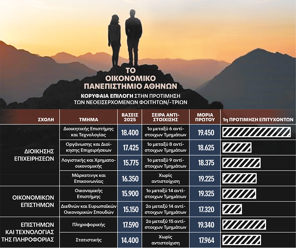 Στην πρώτη επιλογή των υποψηφίων συγκαταλέγονται για άλλη μια χρονιά τα οκτώ Τμήματα του Οικονομικού Πανεπιστημίου Αθηνών (ΟΠΑ), όπως επιβεβαιώθηκε από τα αποτελέσματα των φετινών πανελληνίων εξετάσεων. Είναι χαρακτηριστικό ότι σημειώθηκε άνοδος στις βάσεις εισαγωγής σε όλα τα Τμήματα του ΟΠΑ, το οποίο παραμένει συνολικά σταθερά πρώτο στην προτίμηση των υποψηφίων στα επιστημονικά πεδία που καλύπτει. Επιλέγεται από τις άριστες και τους άριστους μεταξύ των υποψηφίων που επιθυμούν να συνεχίσουν το ταξίδι της γνώσης σε ένα σύγχρονο και εξωστρεφές εκπαιδευτικό Ίδρυμα. Πιο αναλυτικά: