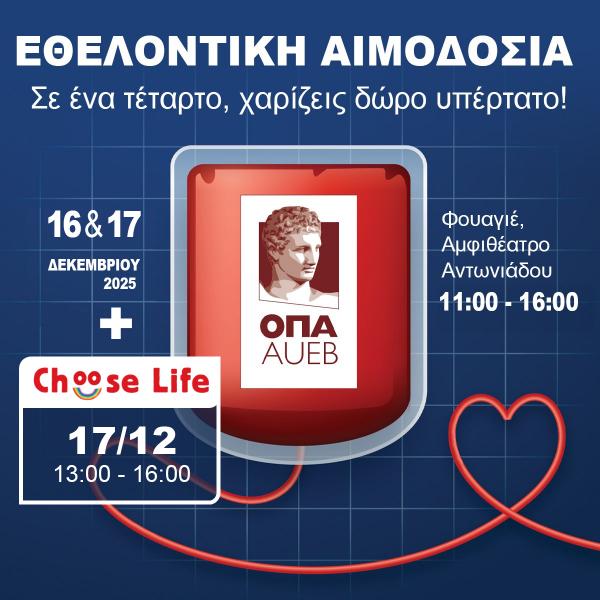 Επίσης, την Τετάρτη 17 Δεκεμβρίου και ώρες 13:00-16:00, θα βρίσκεται στον χώρο του foyer του Αμφιθεάτρου Αντωνιάδου και το Ίδρυμα Choose Life, το οποίο ιδρύθηκε το 2018 με σκοπό τη διεύρυνση της παγκόσμιας βάσης εθελοντών δοτών μυελού των οστών και την υποστήριξη της έρευνας για νέες θεραπείες που μπορούν να αυξήσουν τις πιθανότητες επιβίωσης των ασθενών με αιματολογικά νοσήματα. Θα ενημερώσει τους ενδιαφερόμενους για το έργο του και θα πραγματοποιήσει λήψη δειγμάτων από όσους το επιθυμούν. Συστήνεται στους αιμοδότες να έχουν τυπώσει και συμπληρώσει το «Ερωτηματολόγιο Εθελοντή Αιμοδότη» πριν την επίσκεψή τους στο σημείο αιμοδοσίας. Για την καλύτερη και ασφαλέστερη εξυπηρέτηση των αιμοδοτών, οι αιμοληψίες θα προγραμματιστούν με ραντεβού, στον σύνδεσμο: https://calendly.com/aueb_/blood_donation?month=2025-12 ή στο τηλέφωνο 210 8203216 κυρία Α. Αργυροπούλου.
